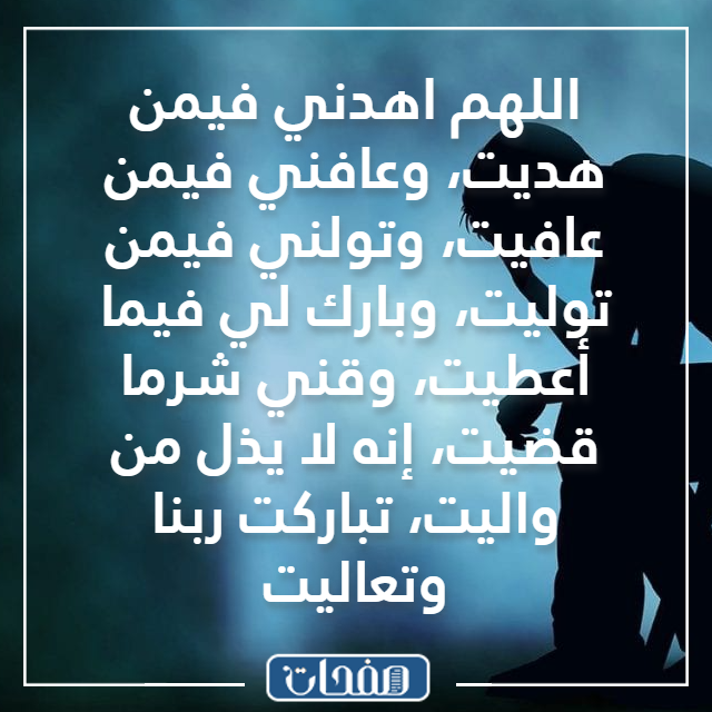 - اللهم اهدني فيمن هديت، وعافني فيمن عافيت، وتولني فيمن توليت، وبارك لي فيما أعطيت، وقني شرما قضيت، إنه لا يذل من واليت، تباركت ربنا وتعاليت.