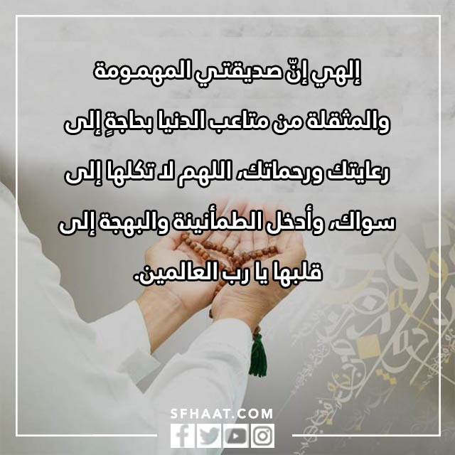 - ربي أسألك أن تنفس كرب صديقتي، وتفرج همها، وأعنها على القيام بجميع عباداتك وصلواتك، اللهم نجها في الدنيا، وعافيها واعفوا عنها، وأعتقها من النار جهنم.
