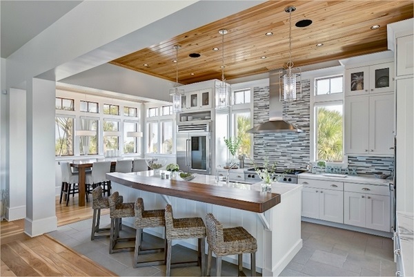إذا كنتِ ترغبين بإضافة لمسة من الخشب إلى ديكور سقف مطبخ المنزل، فالصورة السابقة تعطي مثال للمظهر النهائي للمطبخ، ولكن يجب مراعاة إنه في حالة تم تصميم هذا النوع من أسقف المطابخ فإن على الأرضية أن تكون غير خشبية، وأن يكون اللون المستخدم في المطبخ كاسر للون الخشب في السقف مثل اللون الأبيض.