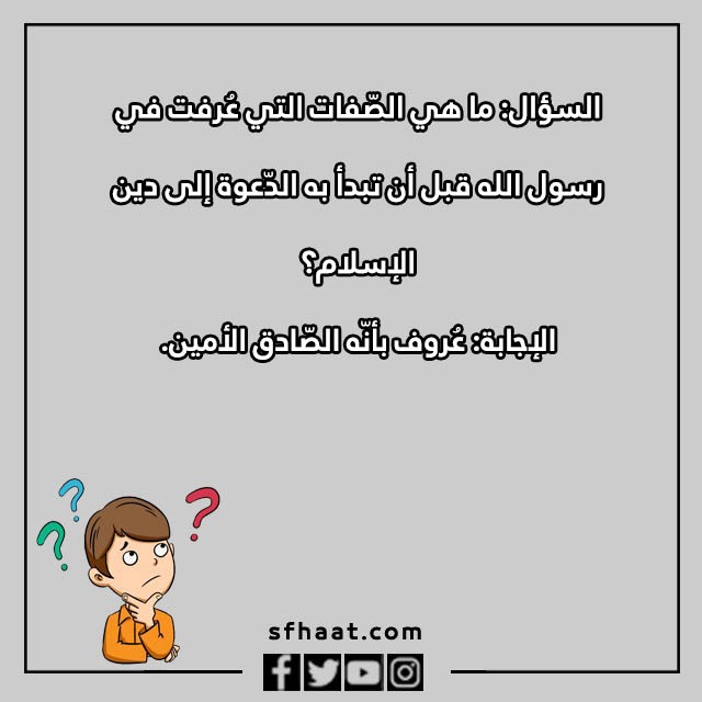 الإجابة: السيدة خديجة -رضي الله عنها وأرضاها- - السؤال: ما هو اللقب الذي كان يُطلق على رسول الله قبل أن تتنزّل عليه الرسالة السماوية من الله؟